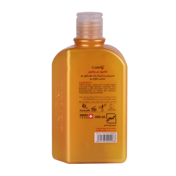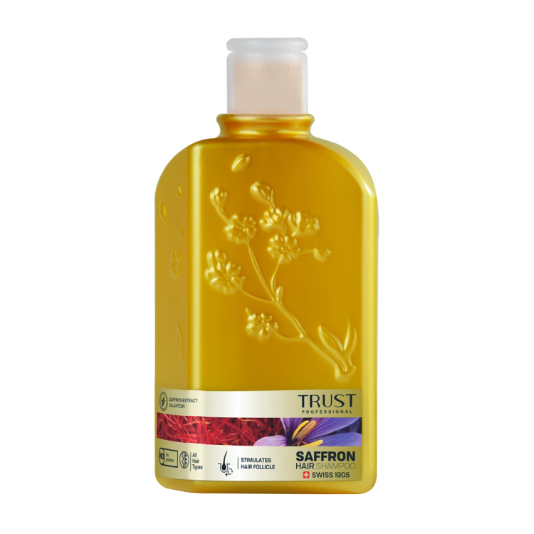 شامپو سر زعفران تراست، با داشتن عصاره زعفران، از ریزش مو جلوگیری کرده و مواد مغذی مورد نیاز مو را به آن میرساند. همچنین این محصول با تحریک فولیکولهای مو، رشد آن را افزایش داده و آن را تقویت میکند.