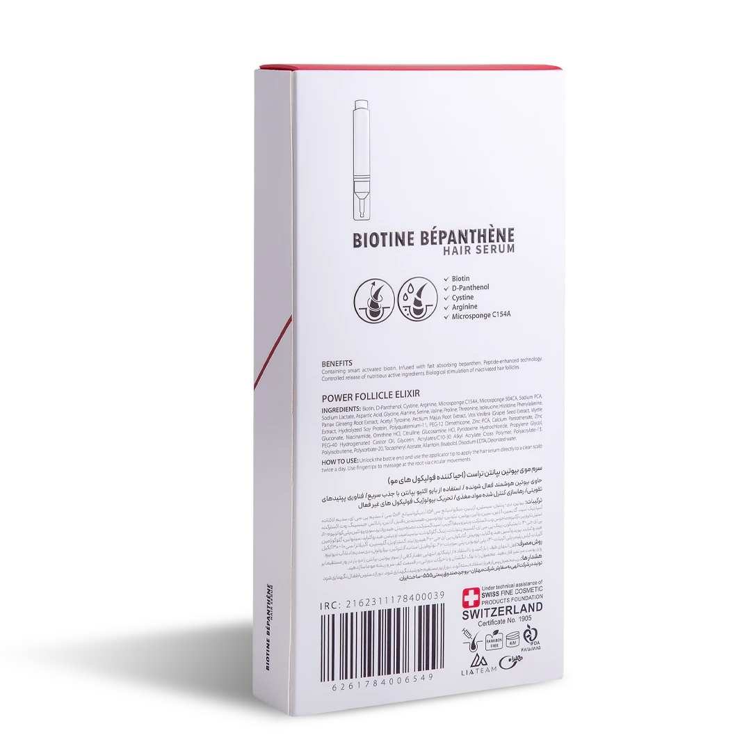 نحوه مصرف : قفل انتهای ظرف را باز کنید و با استفاده از اپلیکاتور انتهایی مقدار کافی از سرم بیوتین بپانتن را دو بار در روز مستقیما بر روی پوست سر تمیز قرار دهید. محصول را با نوک انگشتان و با حرکات دورانی در قسمت کف سر و ریشه مو ماساژ دهید.