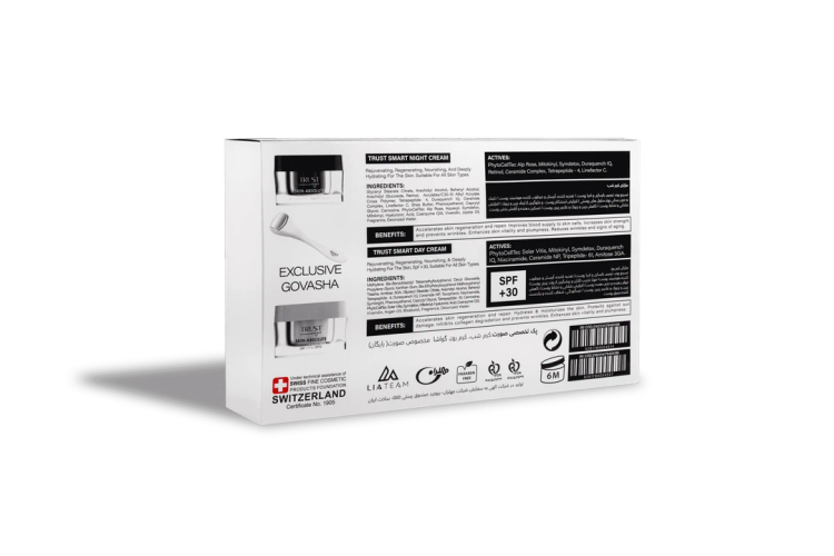 جوان کننده پوست با داشتن ترکیبات فعال پپتیدی، آمیتوز 3GA، Duraquench IQ، عصاره سلول بنیادی دانه انگور، میتوکینیل، ویوندین و کوآنزیم کیوتن افزایش استحکام پوست و رفع چین و چروکهای پوستی با داشتن ترکیبات فعال پپتیدی تتراپپتاید-۴، تتراپپتاید-۶۱، سرامید NP، هیالورونیکاسید و توکوفرول مهار کننده پرتوهای UV و روشنکننده پوست با داشتن ترکیبات فعال آمیتوز 3GA، نیاسینآمید، سیمبرایت، سیمدتوکس و میتوکینیل حاوی ترکیبات فیلتر کننده پرتوهای UV و مراقبت از پوست در برابر این پرتوها با داشتن SPF 30+ تسکیندهنده التهابات پوستی با داشتن ترکیبات فعال ویوندین، نیاسینآمید، روغن آرگان و بیزابولول مواد مؤثره کرم روز تراست اسمارت: