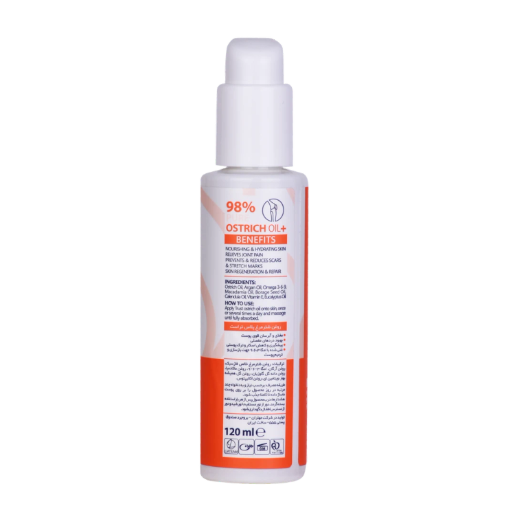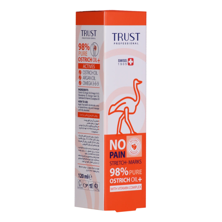 روغن شترمرغ غنی شده تراست برای اولین بار با بهره گیری از فاز سبک روغن شترمرغ بصورت کاملا خالص (خلوص 98 درصدی) در کنار یک کمپلکس ویتامین در کنار روغن کالاندولا و روغن جوجوبا همراه با کره گیاهی (شی باتر) سبب حفاظت از پوست در برابر شرایط سخت محیطی میگردد. روغن شترمرغ غنی از امگا 3 و امگا 6 بوده که در کنار روغن جوجوبا با توانایی نفوذ به لایههای زیرین پوست، علاوه بر بازسازی و بهبود عملکرد پوست موجب آبرسانی طولانیمدت پوست میگردد.