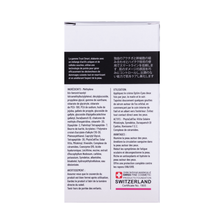 این ترکیب کمپلکسی کپسوله شده از ترکیبات فعال عصاره جلبک، کافئین و عصاره گیاهی است که به عنوان ترکیب فعال اختصاصی در جهت رفع تیرگی و حلقههای تیره دور چشم در فرمولاسیون کرم دور چشم ضد چروک و تیرگی اسمارت تراست مورد استفاده قرار گرفت. تکنولوژی مورد استفاده در انتقال این ترکیبات فعال به نحوی طراحی شده است که ترکیبات فعال به لایههای عمقیتر پوست نفوذ کرده و بیشترین تاثیر را در این ناحیه ایجاد میکنند. این ترکیبات با توانایی بالایی که برای گشاد کردن عروق خونی زیر چشم دارند، التهابات پوست در این ناحیه را تسکین میبخشند، و به رفع تیرگی دور چشم کمک میکنند.